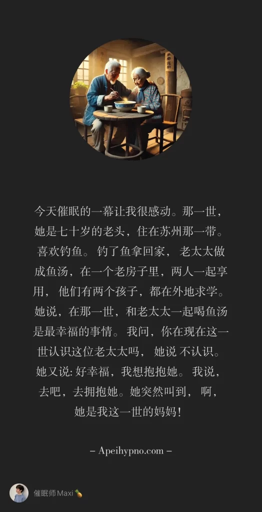 她问我,作为催眠师,在带个案经历不同场景的时候 我会有感触吗? 我的回答是: 当然,当你的意识回到某一世的时候,我的意识也在那里。 在催眠状态下,我们的分子和原子 存在于在同一个空间。